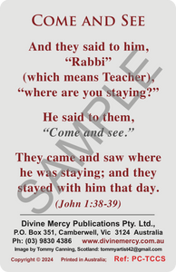 Prayer card with image by artist Tommy Canning titled 'Come and See' with a quote from the Bible.