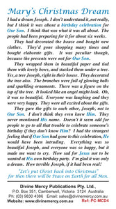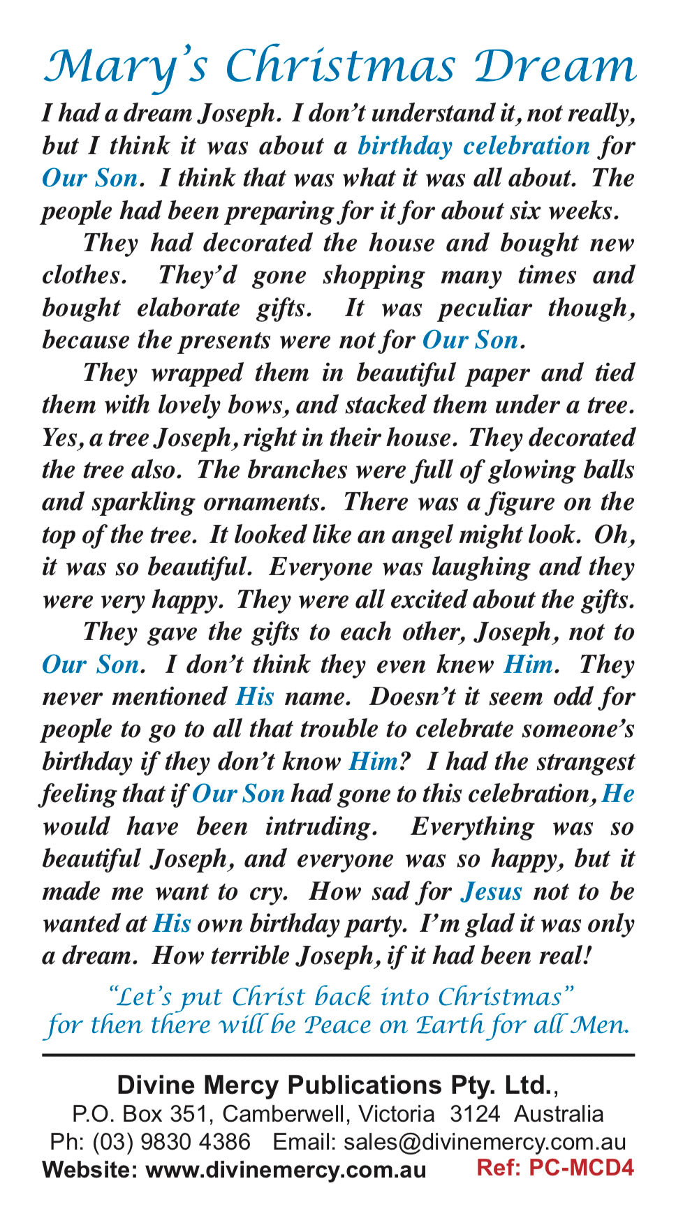 These beautiful full-colour laminated prayer cards have the Mary’s Christmas Dream story on the back. A story from an unknown author of Mary telling Joseph about a dream she had about the ‘future’ celebration of Christmas and how people were not celebrating Jesus’ birthday. An enlightening story that makes people think about the true meaning of Christmas.